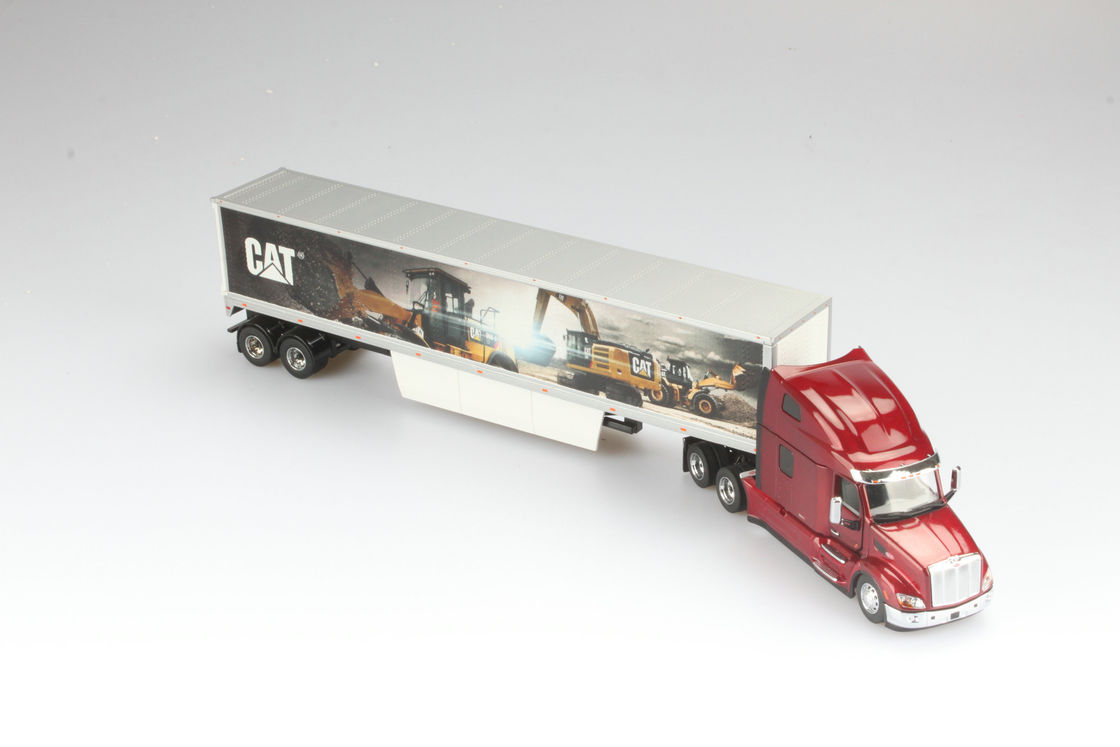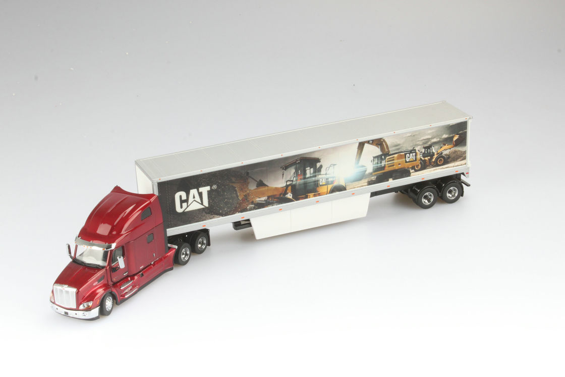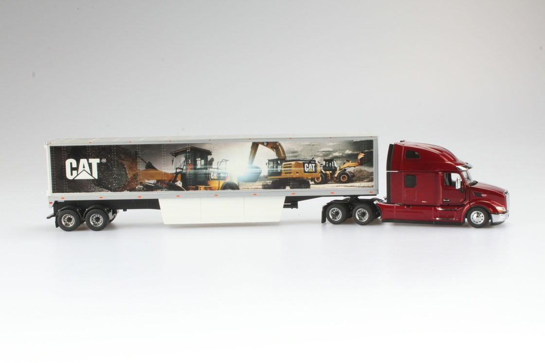 | Pintura y Calcomanías | Pintura auténtica Peterbilt Chrome Dark Red, mural Caterpillar en el remolque van seco, calcomanías detalladas, rayas de regulación DOT |